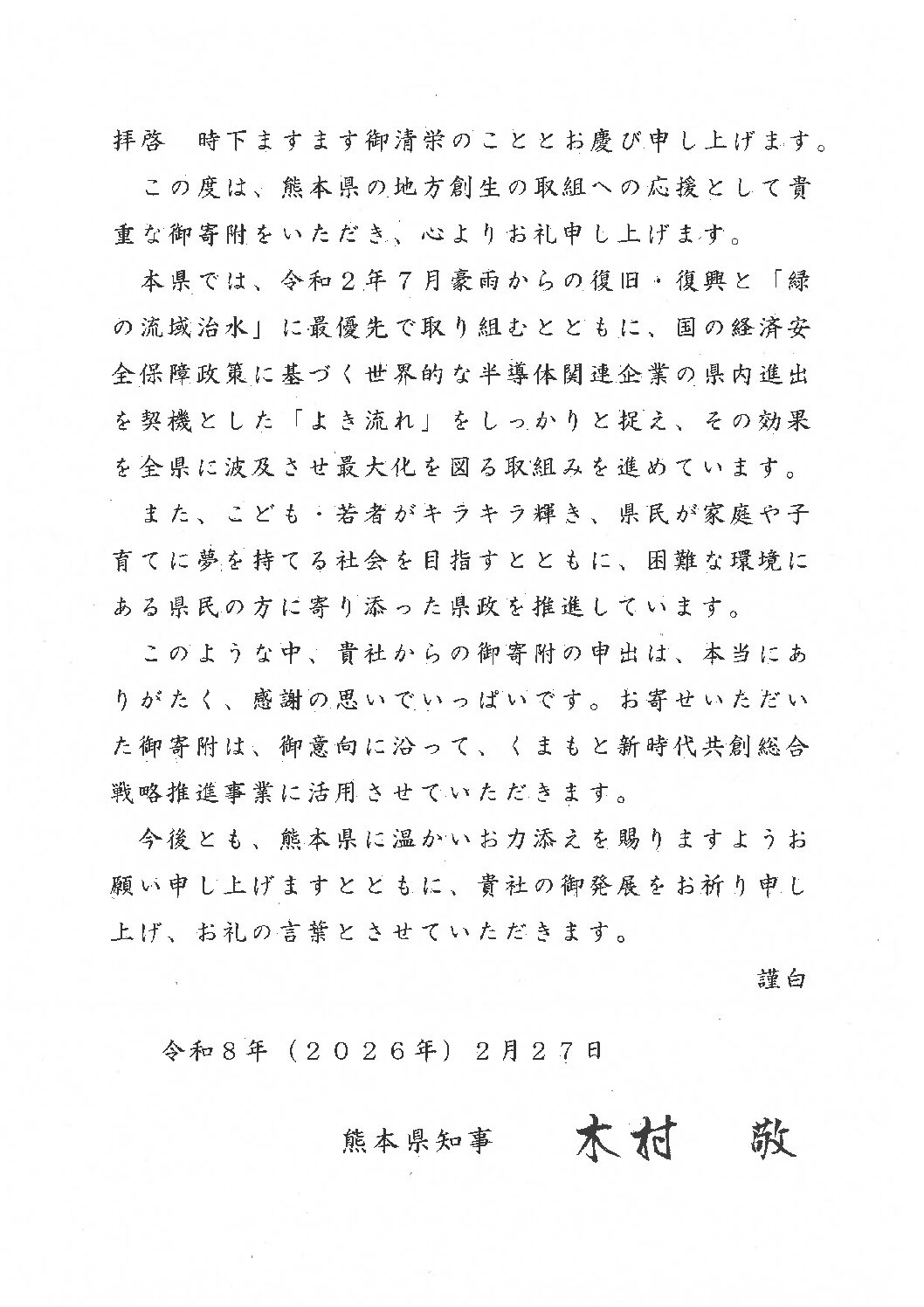 熊本県知事よりお礼状をいただきました。
